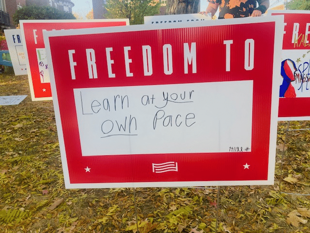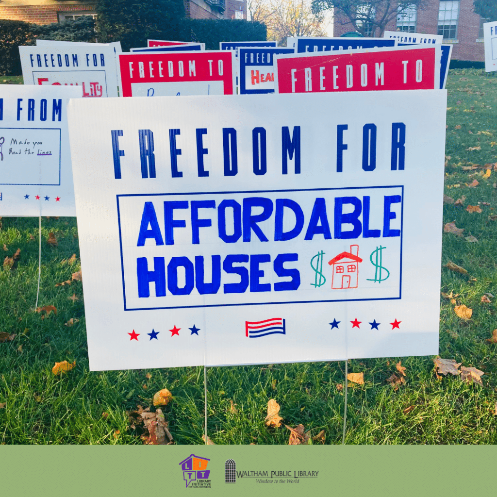 The annual For Freedoms lawn sign project is now on view on the Waltham Public Library lawn, which it has graced every fall in recent years. It is a creative and civic-minded project that celebrates the voices of Waltham youths not old enough to vote but old enough to have strong opinions about the world in which they live.