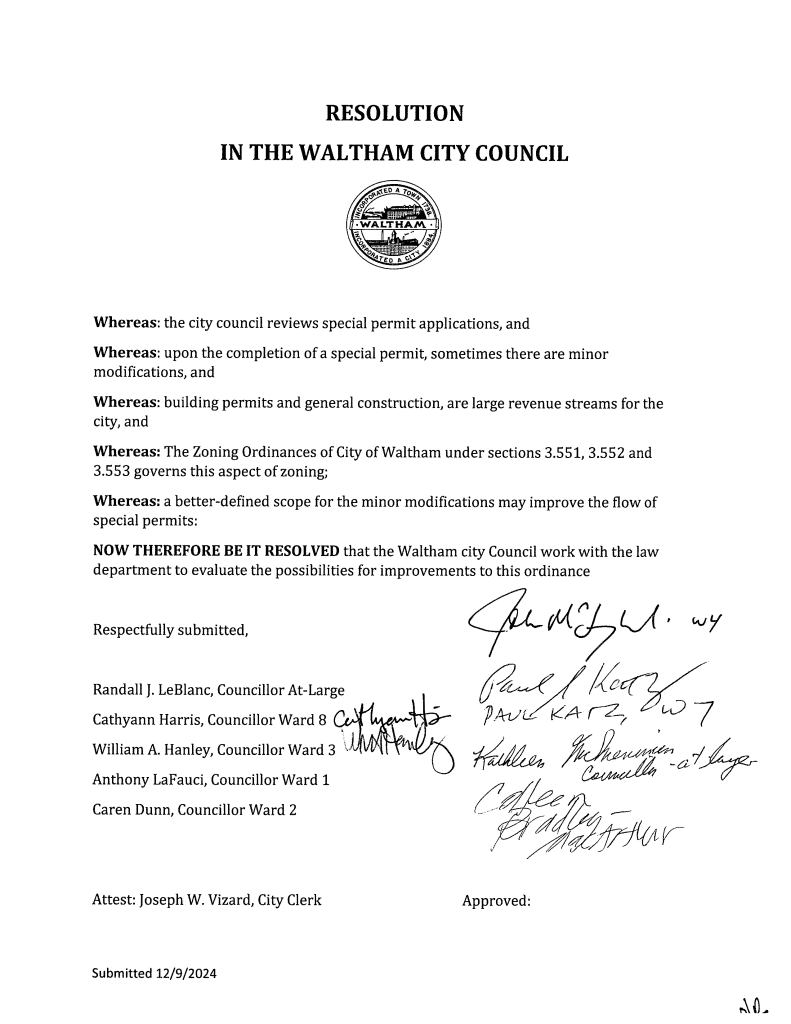 - The council heard a resolution (right) regarding the processes to obtain a special permit modification from the Zoning Board of Appeals. The resolution aims to better define what counts as a ‘“minor modification”’ and what needs to be fully re-permitted. This issue has recently been the focus of discussion at multiple Ordinances and Rules Committee meetings. The council referred the resolution to the Ordinances and Rules Committee for further recommendations.