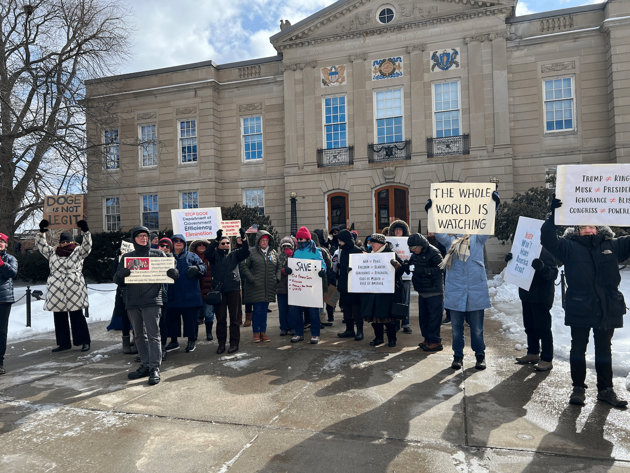 The protesters included Waltham City Councilor-at-Large Colleen Bradley-MacArthur, who posted photos of the event on social media. In her Instagram post caption, Bradley-MacArthur wrote: “I’m grateful for the 30 or so Waltham residents that braved the cold to share their concerns over things that are happening at the national level. Make no mistake, these actions have implications right here in Waltham.”
