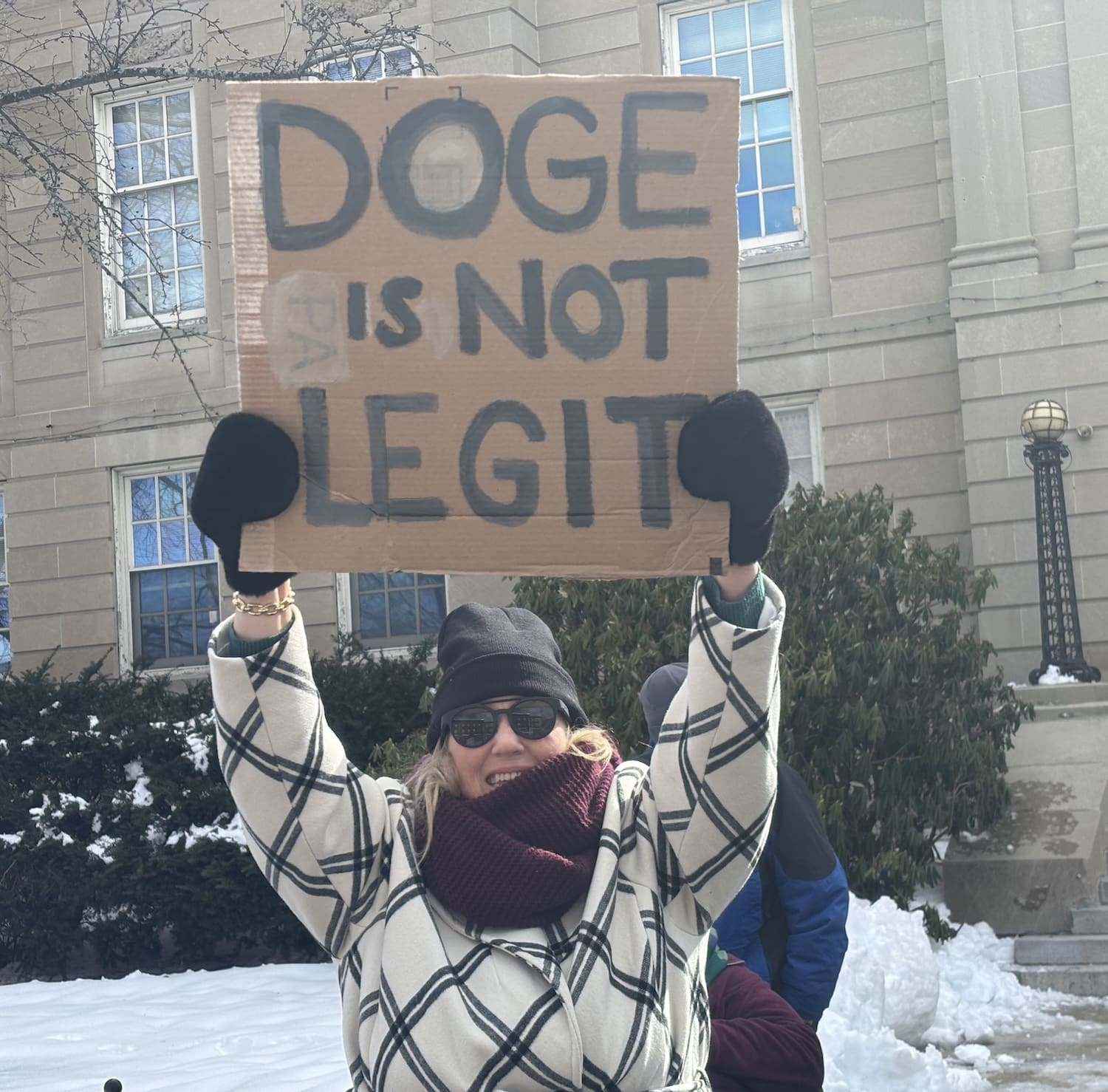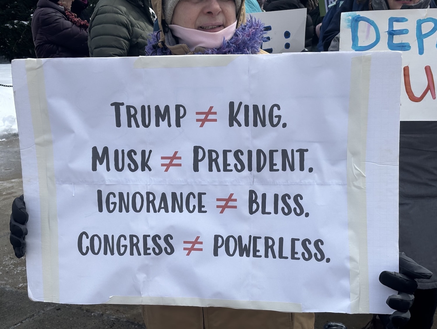 The Waltham protesters carried signs critiquing President Donald J. Trump as well as Elon Musk, who has “special government employee” status, and the Department of Government Efficiency (DOGE).