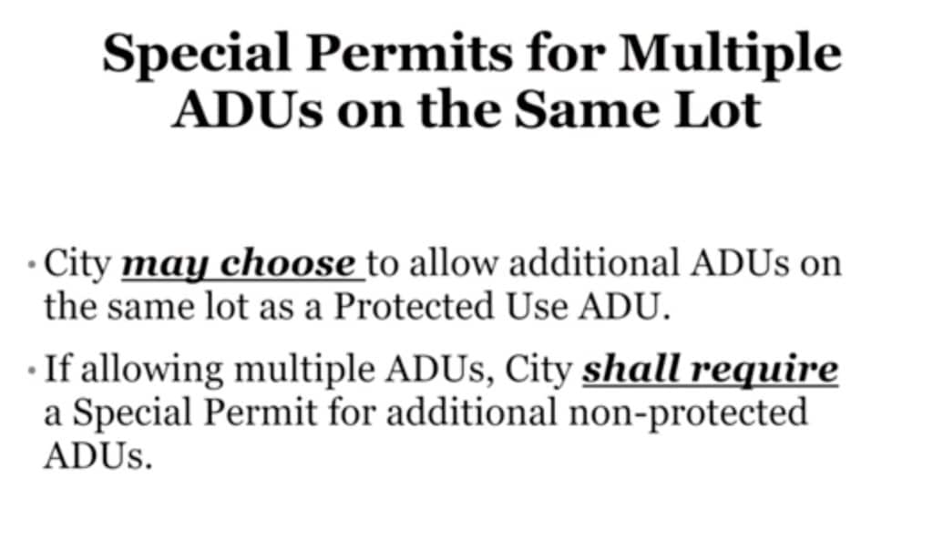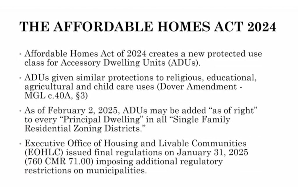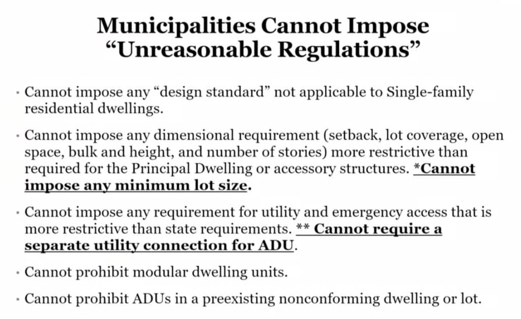 “I’m not opposed to ADUs,” she said. “I’m opposed to ADUs by right without clear regulations from the state.”