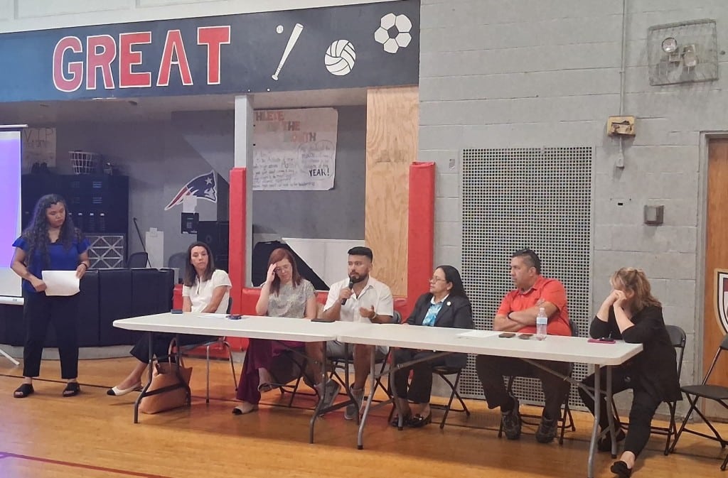 Attendees didn’t fully fill the chairs at the event, held in the gym at the Waltham Boys & Girls Club. Mayor Jeannette McCarthy and City Councilor-at-Large Colleen Bradley-MacArthur were among the attendees. Bradley-MacArthur wore a pink vest from Fuerza, a local group supporting families impacted by ICE enforcement actions.