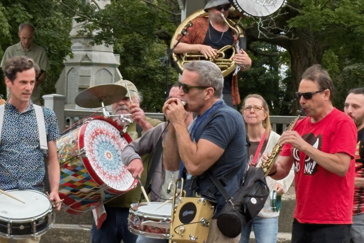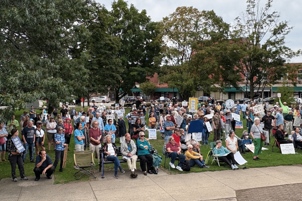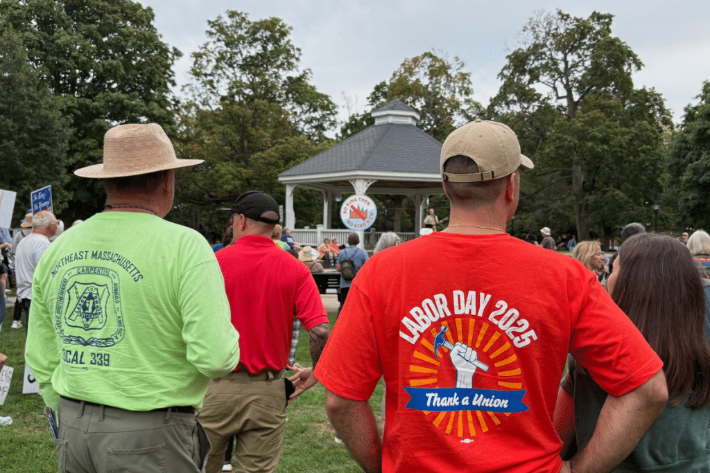 More than 500 people gathered on Waltham Common on Labor Day to call for protections to democracy, health care and climate action.