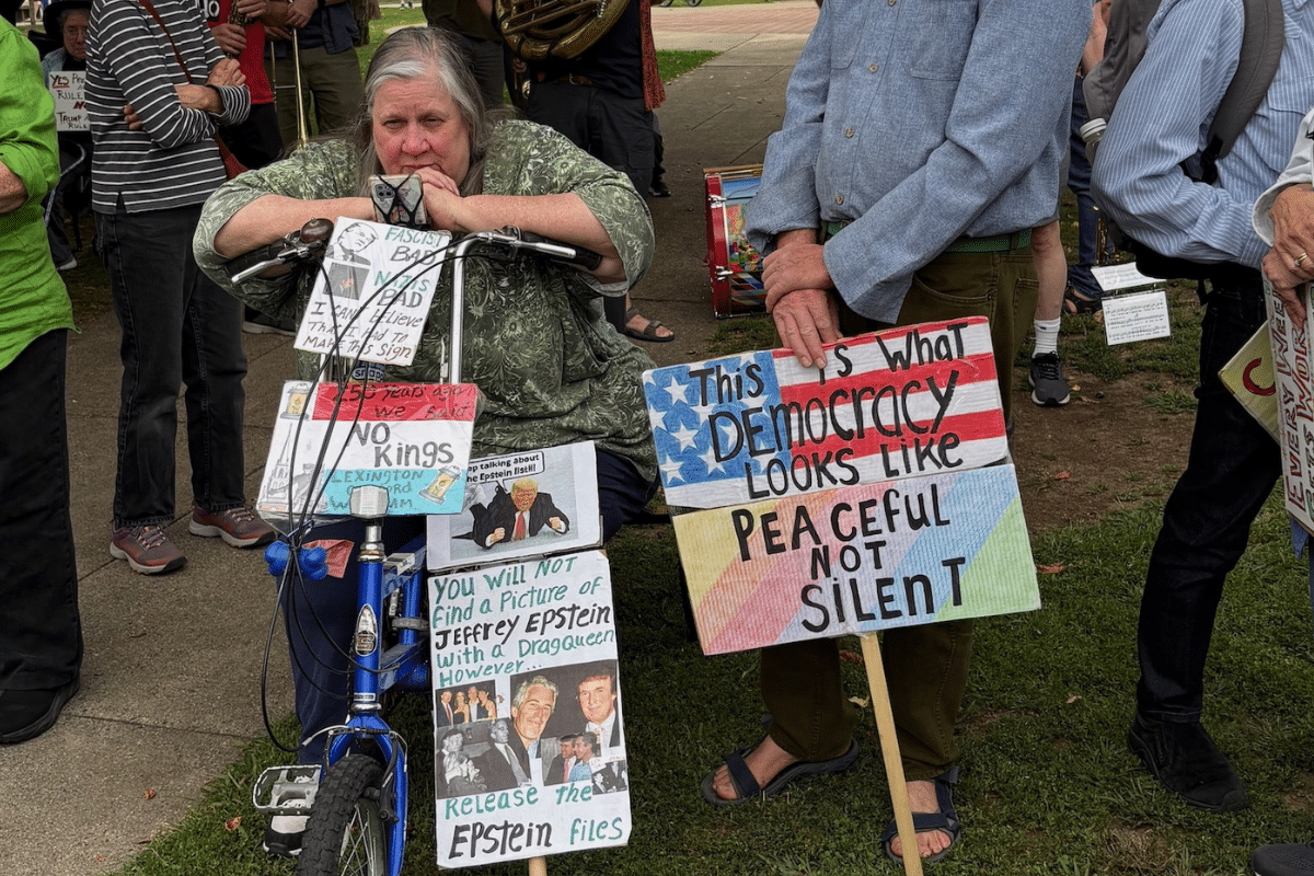 The demonstration, organized by Indivisible Waltham, featured teachers, nurses, parishioners, veterans and activists. Participants carried homemade signs with messages such as “No kings,” “Hands off my medical insurance” and “Stop the cruelty.”