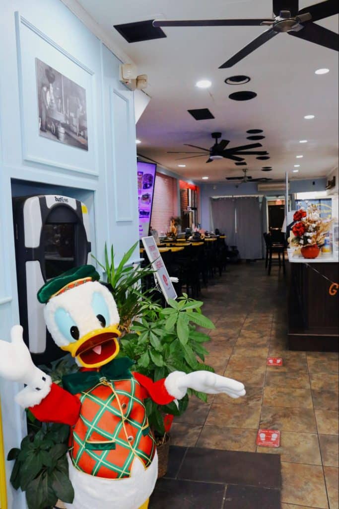 An eclectic hospitality radiates from the space. Near the entrance, the walls are painted blue, hung with vintage posters, and a side table is cluttered with straws and stirrers. Near the front door, a Donald Duck figurine greets customers as they walk in. Further in, the blue walls give way to exposed brick. A small white shelf holds a teapot and cups painted with blue Chinese landscapes. Nearby, panels of smiling flowers by Japanese contemporary artist, Takashi Murakami, hang on the wall. The mix feels less like decoration than layers of memory, giving the café the texture of a lived-in room.