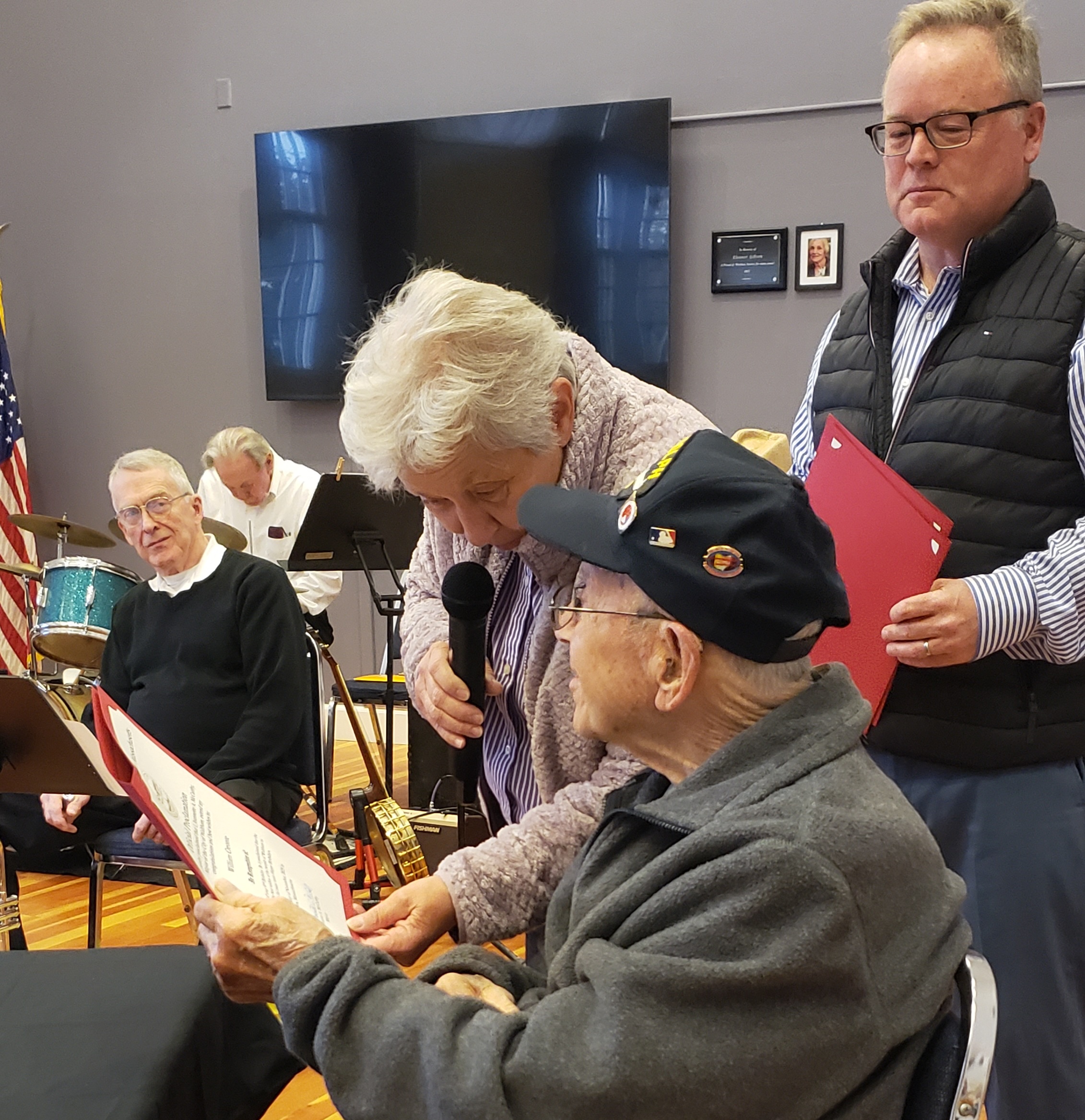 Council on Aging director Patrick O’Brien said that after World War II, there were 16 million veterans. A year ago, there were 100,000, but today only an estimated 45,000 WWII vets are still alive. When Deborah Barry, the Council’s administrative assistant, suggested a celebration focusing on Waltham’s WWII vets, he jumped on the idea, which led to Thursday’s celebration.