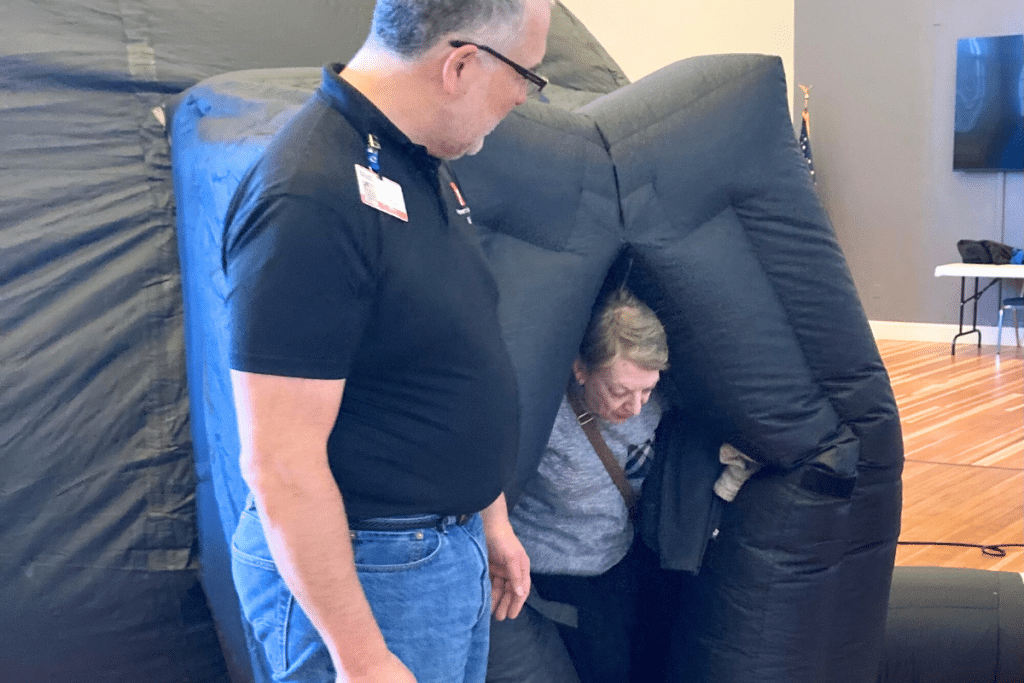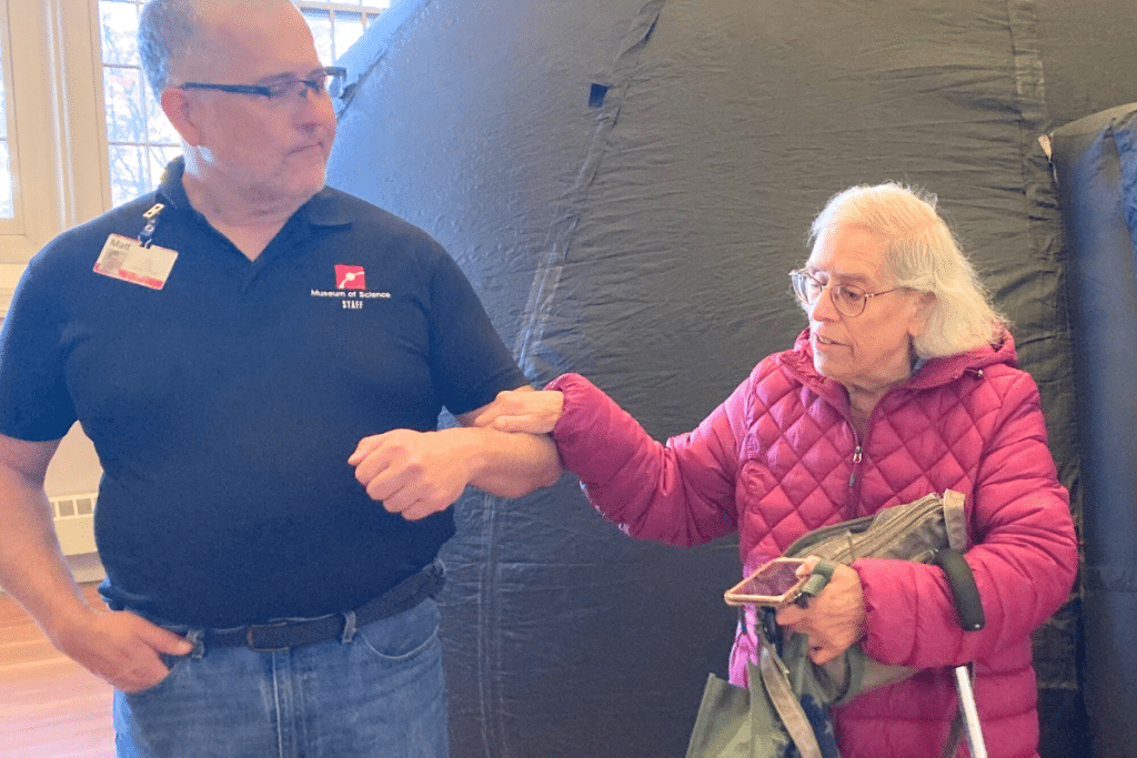 Groups of seniors gathered in a circle of chairs inside the inflatable Star Lab, where the museum’s Programs Operations Manager Matt Pacewicz and Senior Education Associate Emily Pease led immersive sessions with the lights dimmed to simulate the real night sky above Waltham from 7 to 9 p.m. on that day. Highlights included identifying visible constellations, planets and the sweep of the Milky Way.