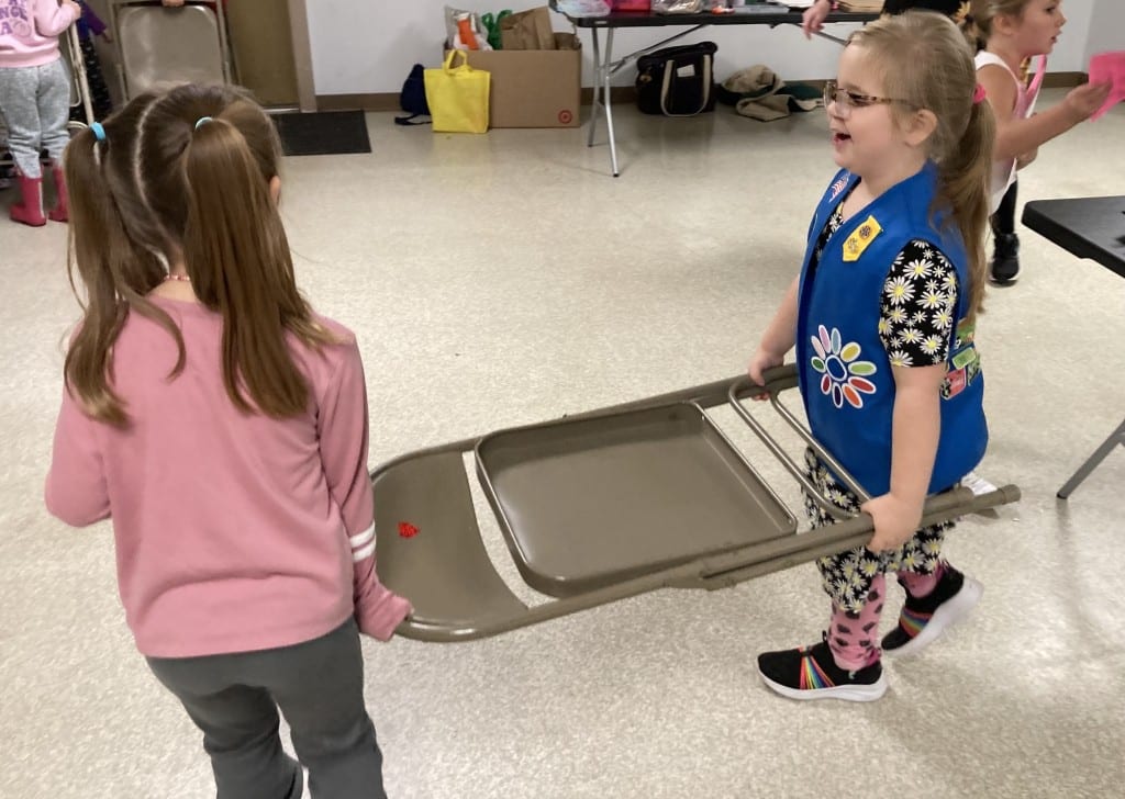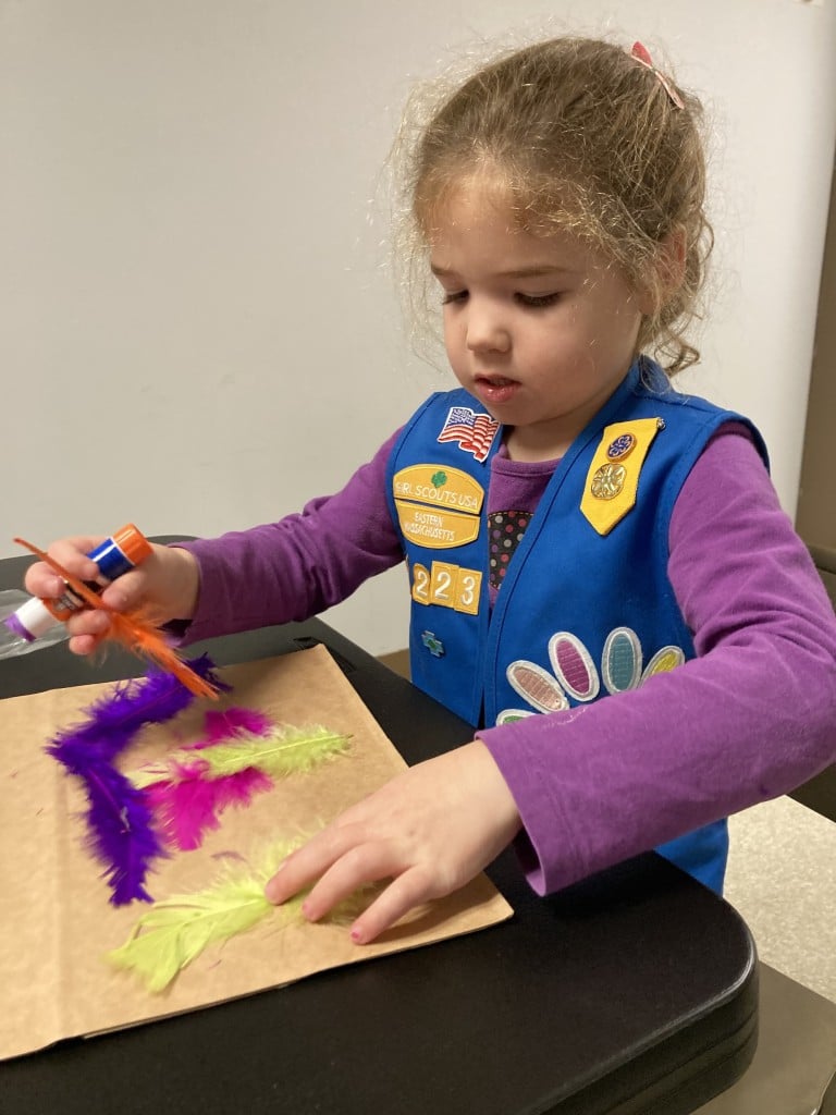 As three adult leaders prepared supplies and discussed the night’s agenda, the girls busied themselves with setting up tables and chairs. At first, the hierarchy was unclear, but as the meeting progressed, the Scouts organized their own workspaces, demonstrating core Girl Scout values: teamwork, initiative, and self-reliance.