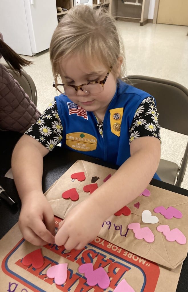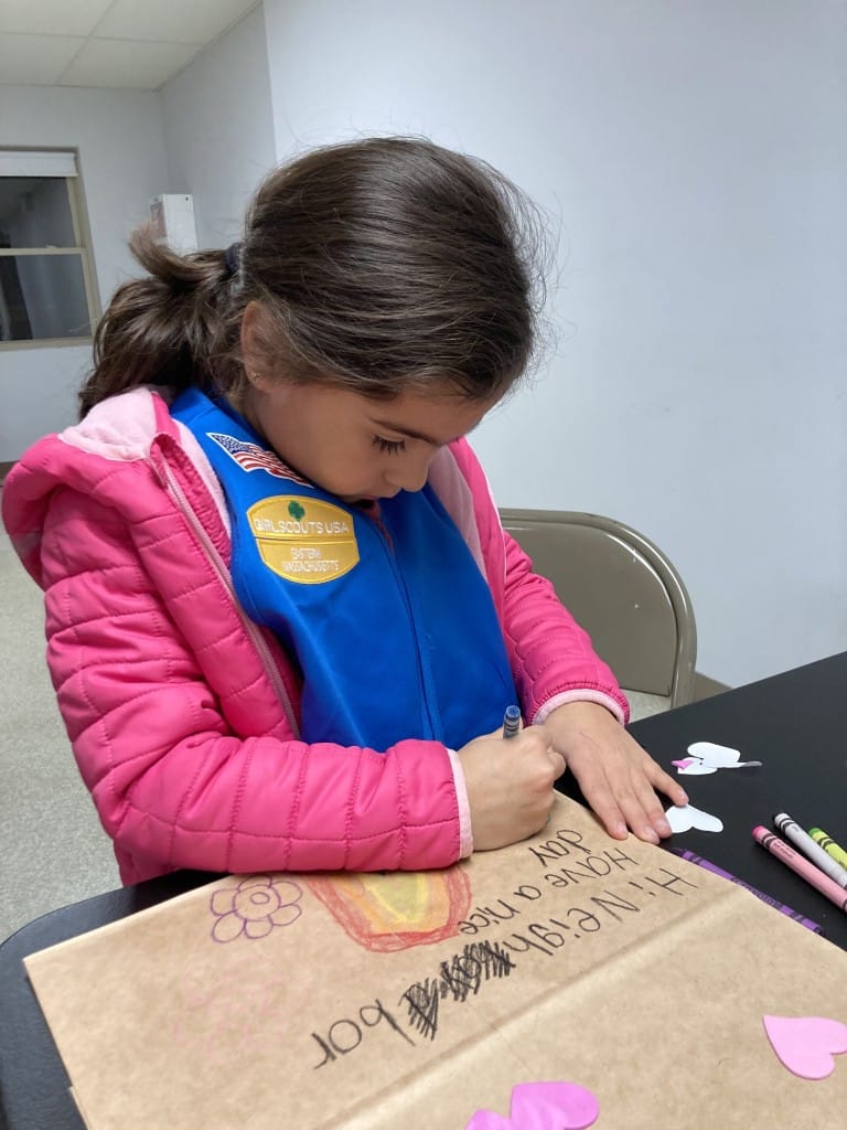 The meeting opened with the Girl Scout promise and law, emphasizing honesty, fairness, and respect. Troop Leader Christie Bilotto introduced the evening’s theme, “Helping Our Neighbors,” guiding the Scouts in two collaborative projects — decorating grocery bags for the Healthy Waltham Food Pantry and crafting colorful greetings for the Tempo restaurant’s “Smiles for Seniors” initiative. Throughout, girls were encouraged to share supplies and assist one another, rather than relying on adult help.