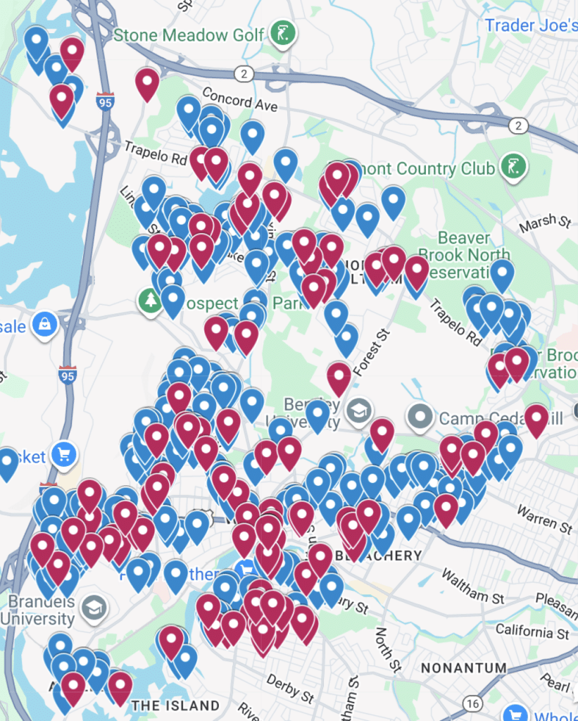 Map of Waltham. Addresses that received the postcard are indicated with a blue drop-pin. Addresses that reported not receiving the postcard are indicated with a red drop-pin.