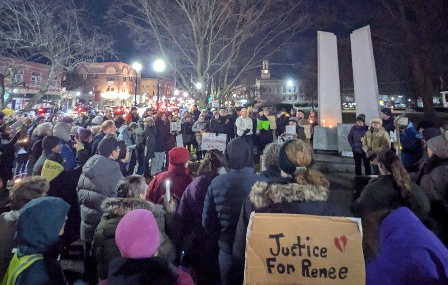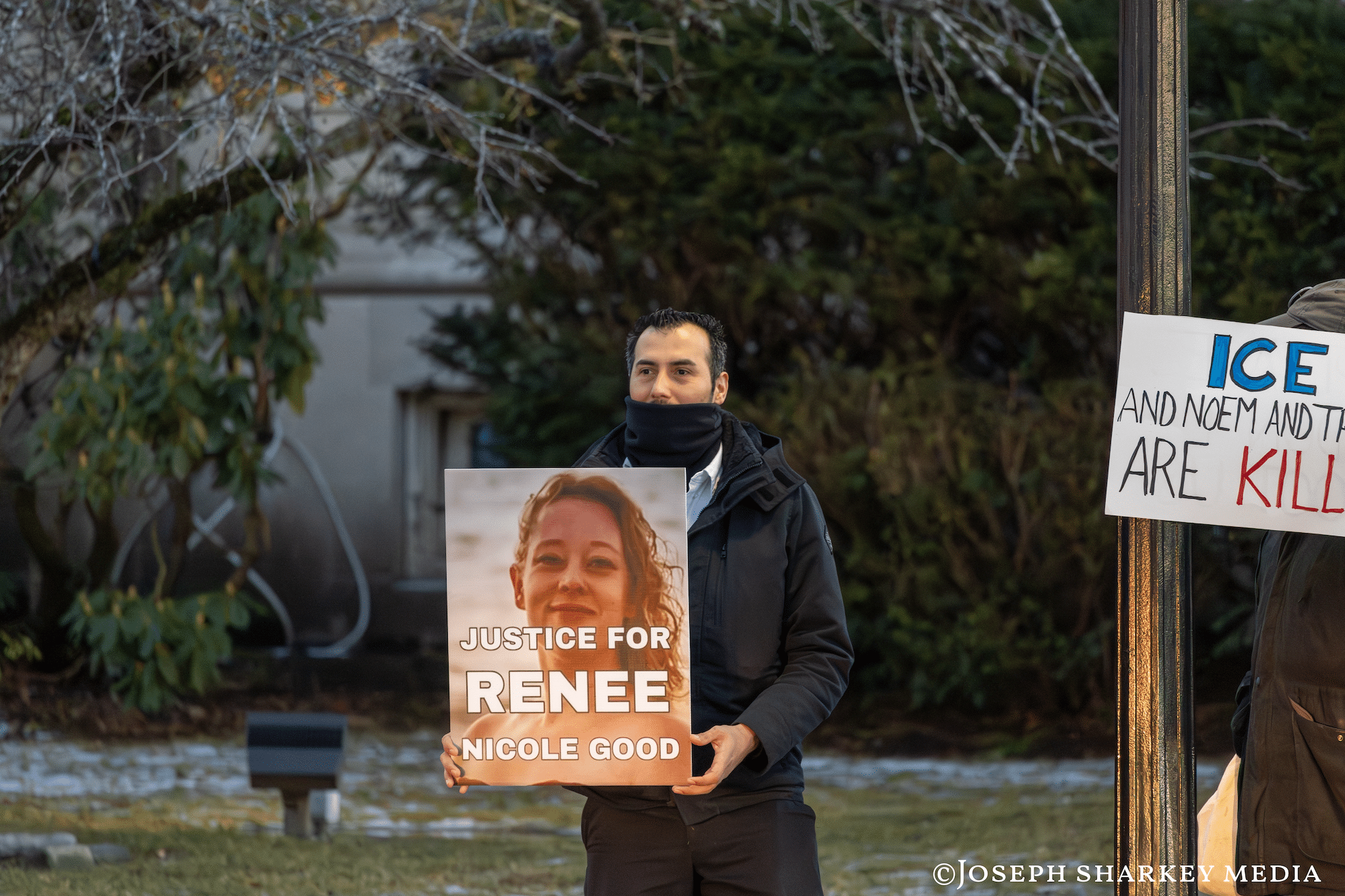 Hundreds of people from Waltham and surrounding communities converged on Waltham Common Thursday, Jan. 8, to protest what organizers call “lawless ICE violence” by the Immigration and Customs Enforcement agency. Many people held signs referring to the fatal shooting of Renee Nicole Good by an ICE agent in Minneapolis on Jan. 6. Dozens of vehicles honked in support as they drove through the intersection of Main and Moody streets.