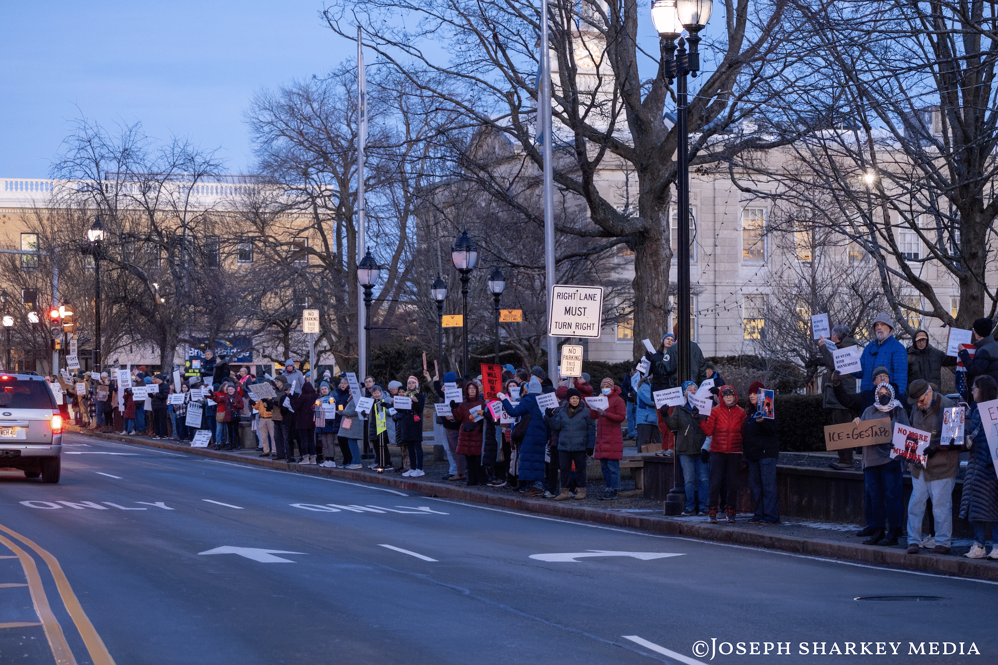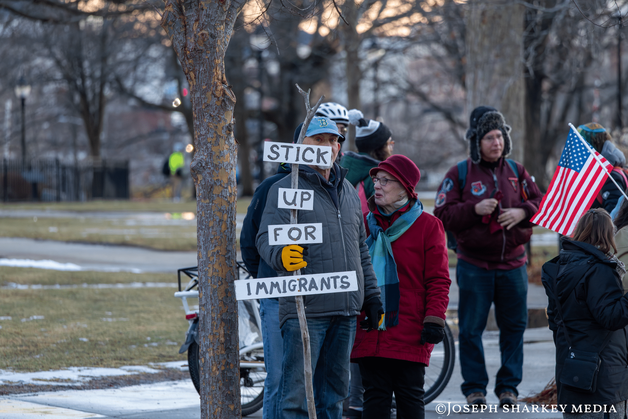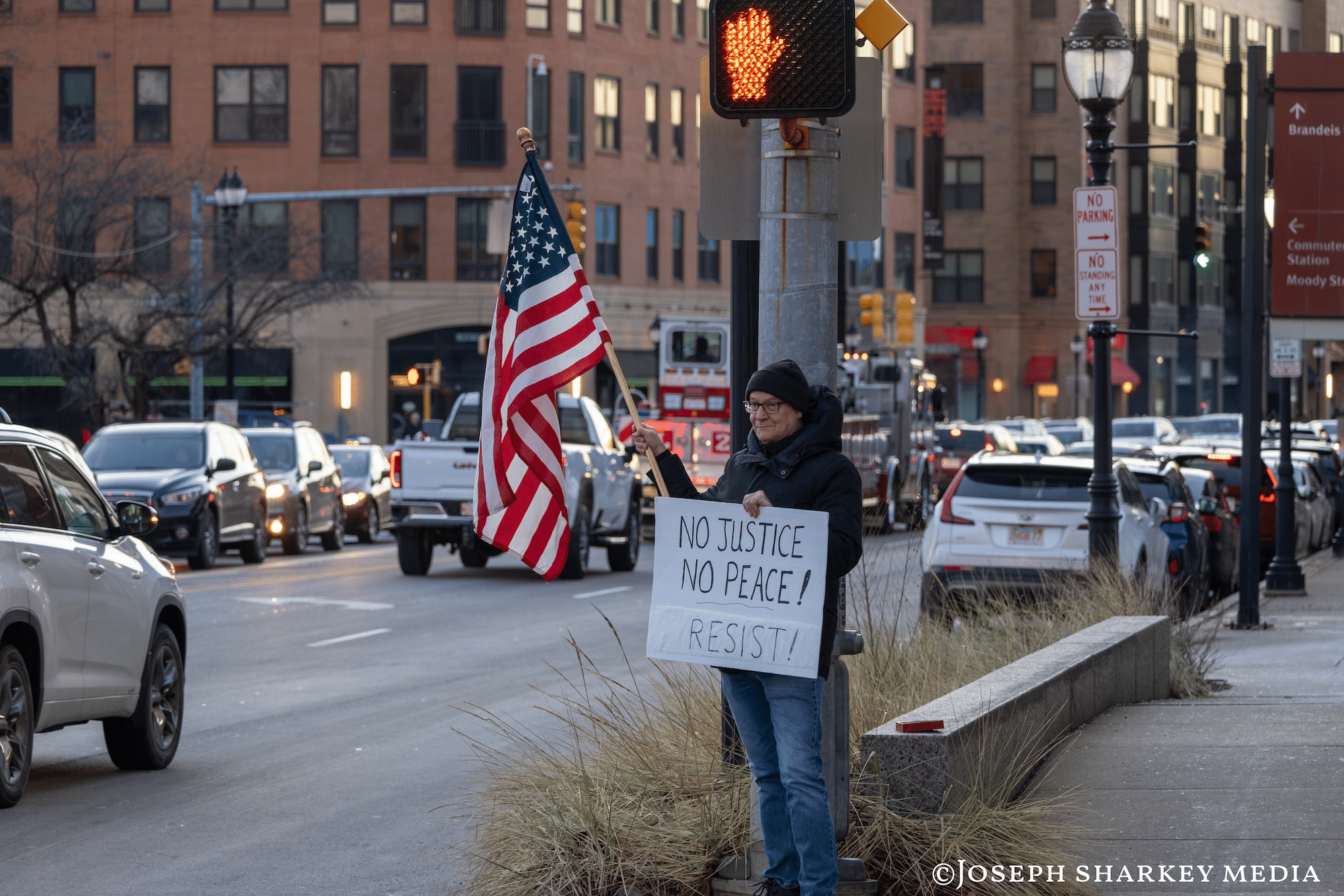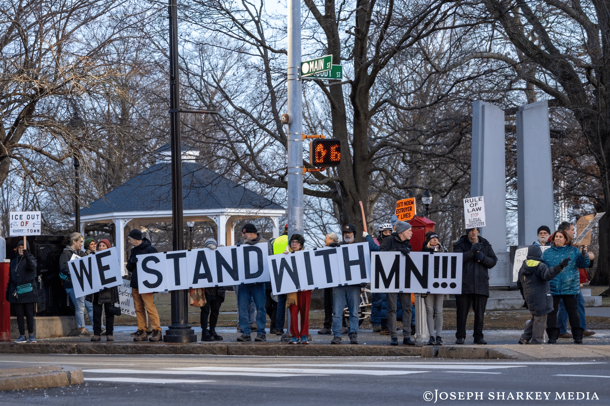 The demonstration was organized by advocacy groups Waltham Concerned Citizens, Indivisible Waltham and Fuerza Waltham. The organizers said they are calling on residents to join a standout on Waltham Common this Saturday, Jan. 10, 11 a.m. to noon, as part of a nationwide protest.