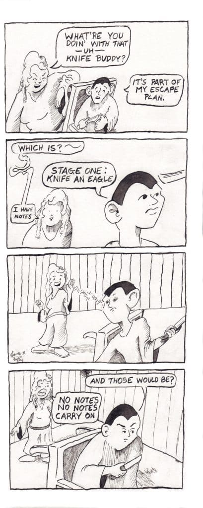 James Willis is a cartoonist, writer and adventurer based in Waltham’s Chemistry district.  Like most good writers, James has worked a string of odd jobs to pay the bills, including: bagging groceries, short order cooking, teaching English in Thailand and stocking shelves in a liquor store.  When not at work James can be found learning languages, studying philosophy, building sci-fi conventions or avenging the death of his master.