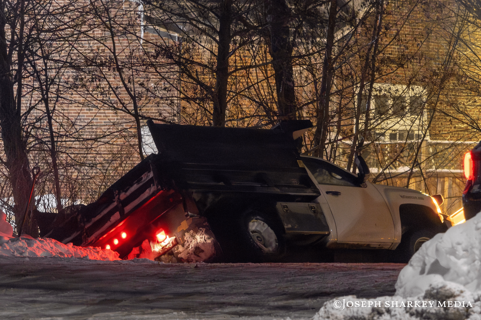 While clearing the parking lot at Century Glass on Lexington Street, a snowplow slid into a ditch and became stuck. A Protech tow truck initially responded but could not free the vehicle, prompting Waltham Auto Tow to lift the plow out later in the day.