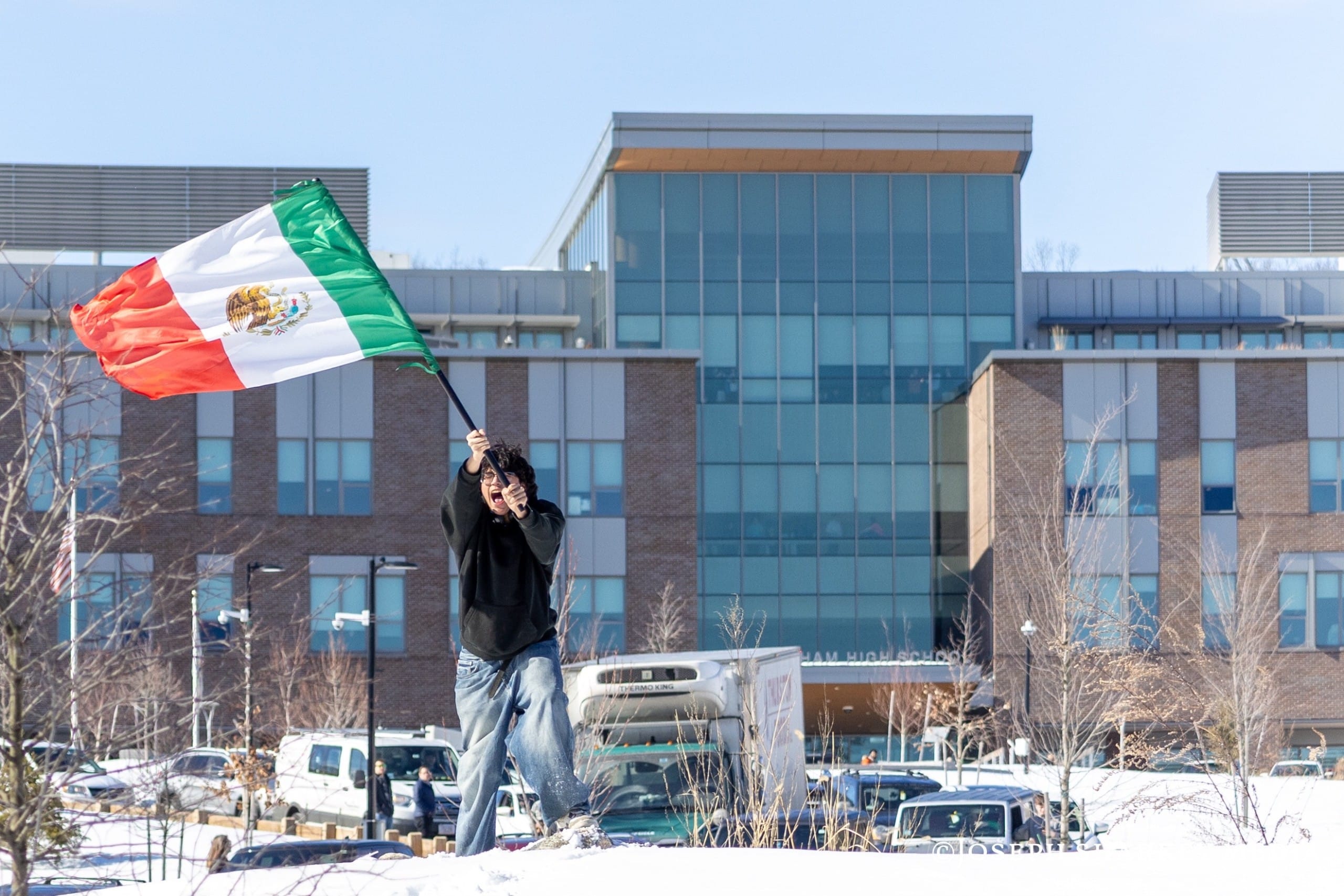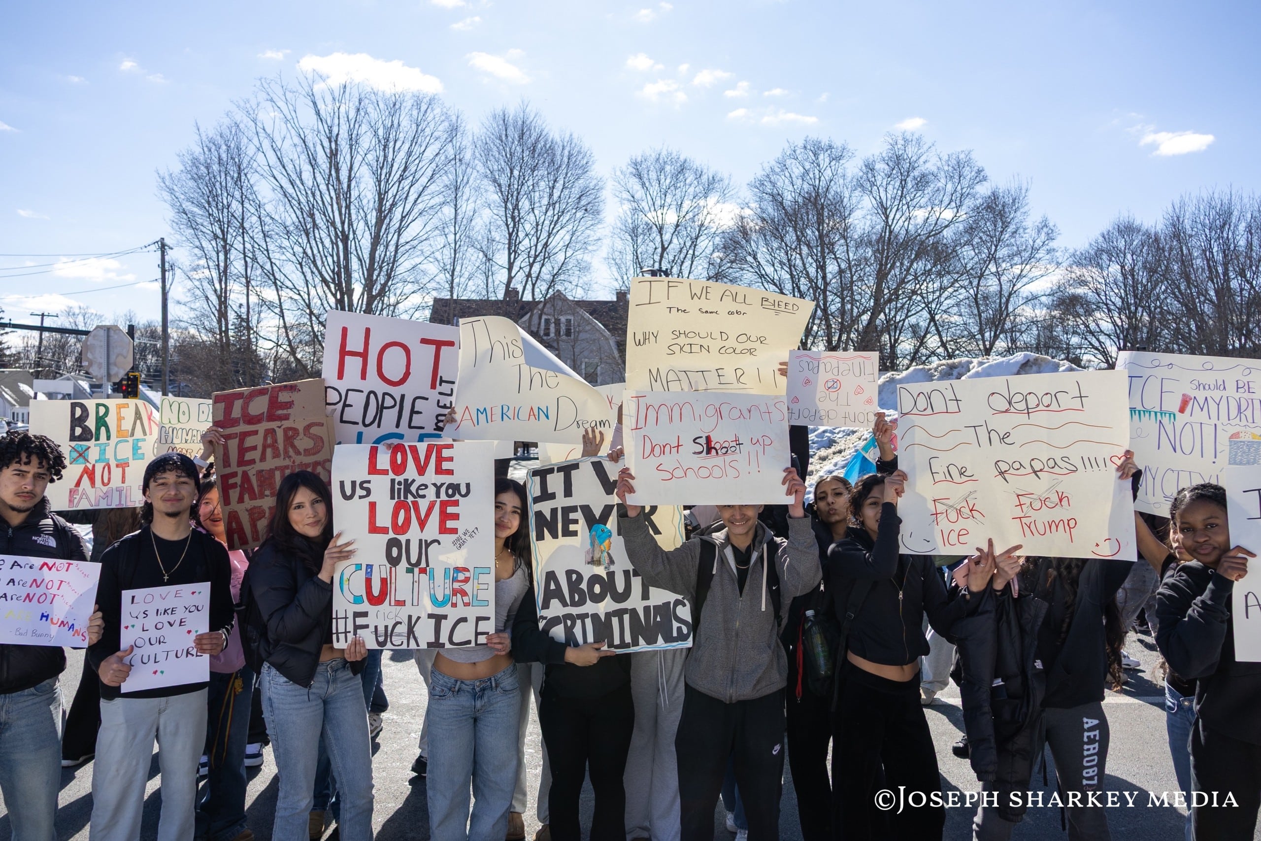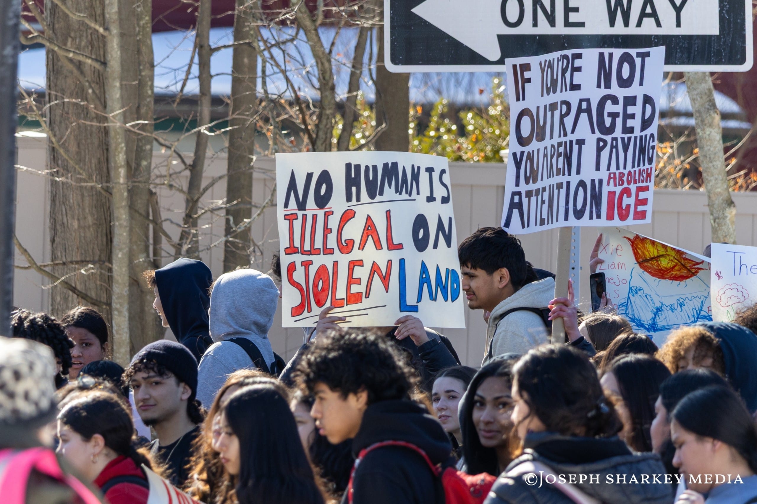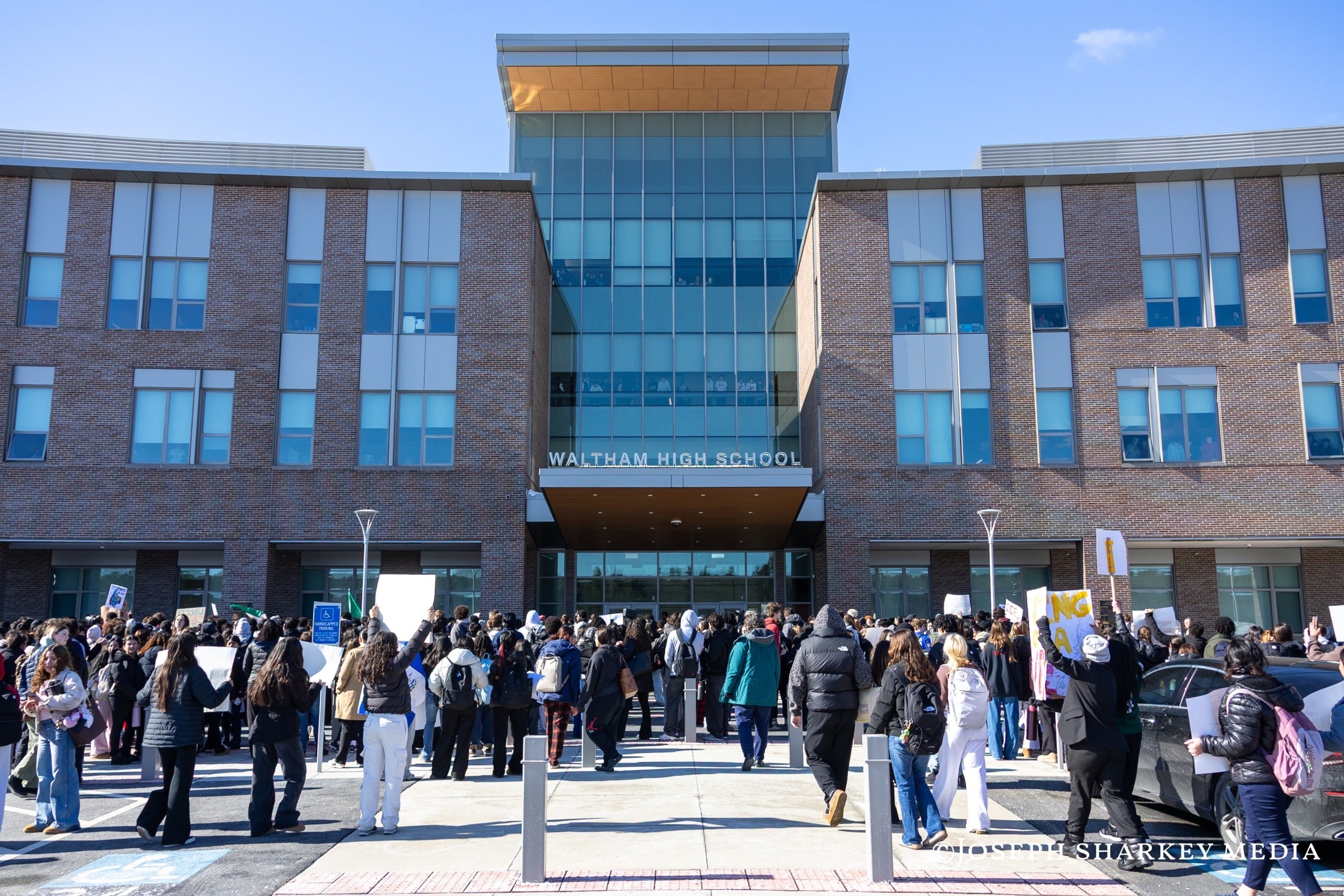 Hundreds of students walked out of Waltham High School on Thursday, Feb. 12, shortly after 1 p.m. to protest U.S. Immigration and Customs Enforcement and voice concerns about immigration enforcement and its impact on students and families.