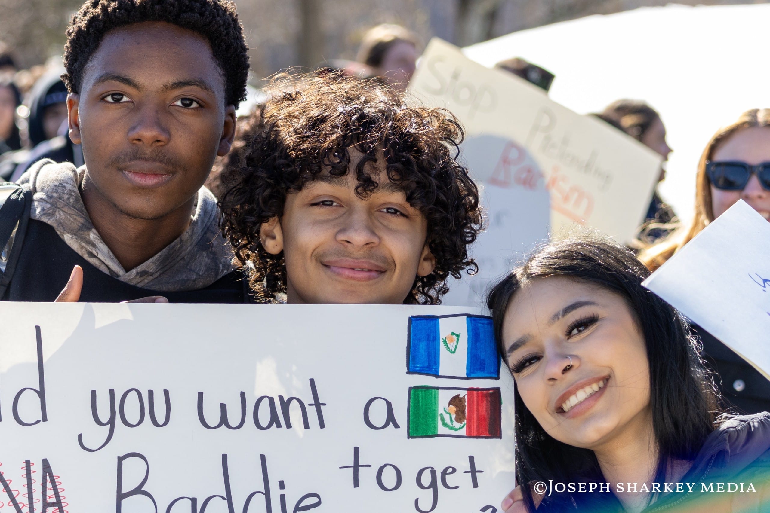 Students first gathered in the school cafeteria before moving outside to the front of the building near Lexington Street. Several students addressed the crowd about immigration enforcement and shared personal concerns related to the issue.