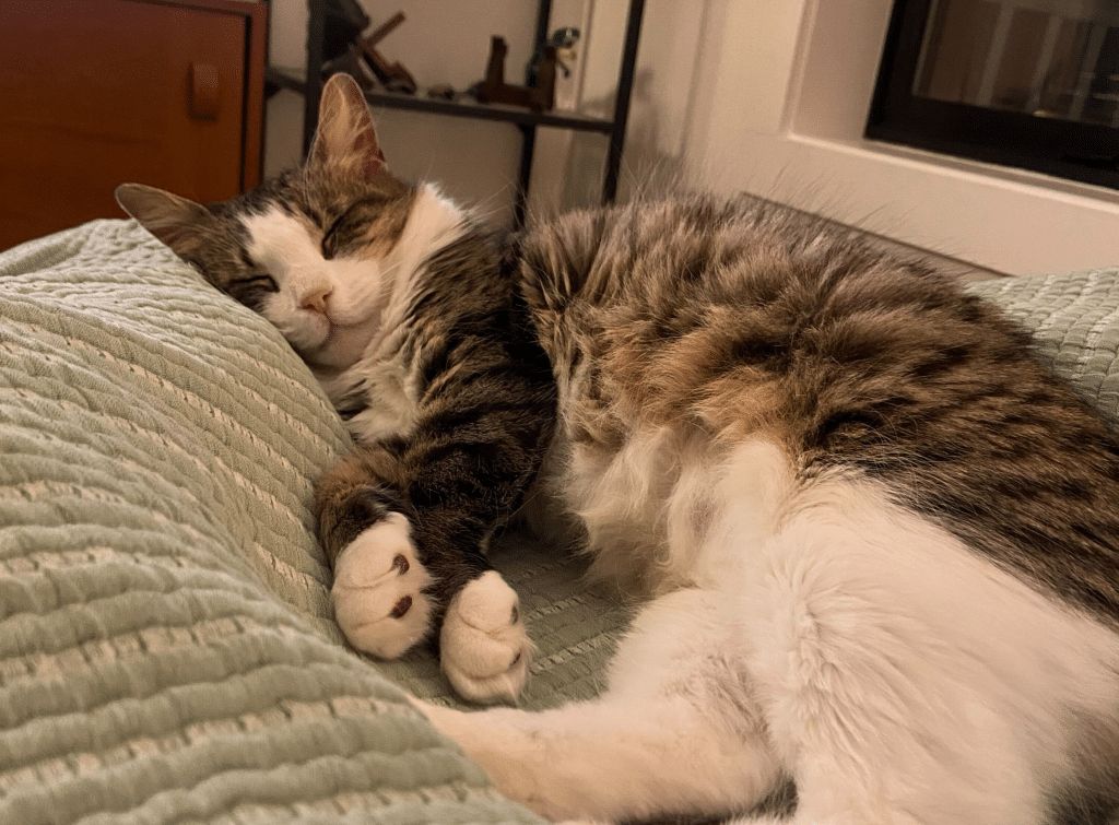 She’s not quite a full lap cat yet, but she’s well on her way. Athena is what we lovingly call a “lap-adjacent” cat. She prefers to snuggle right next to you, inching closer and closer as she gets more comfortable. She’s already choosing to sit beside her people on the couch in her foster home. We wouldn’t be surprised if laps are in her future.