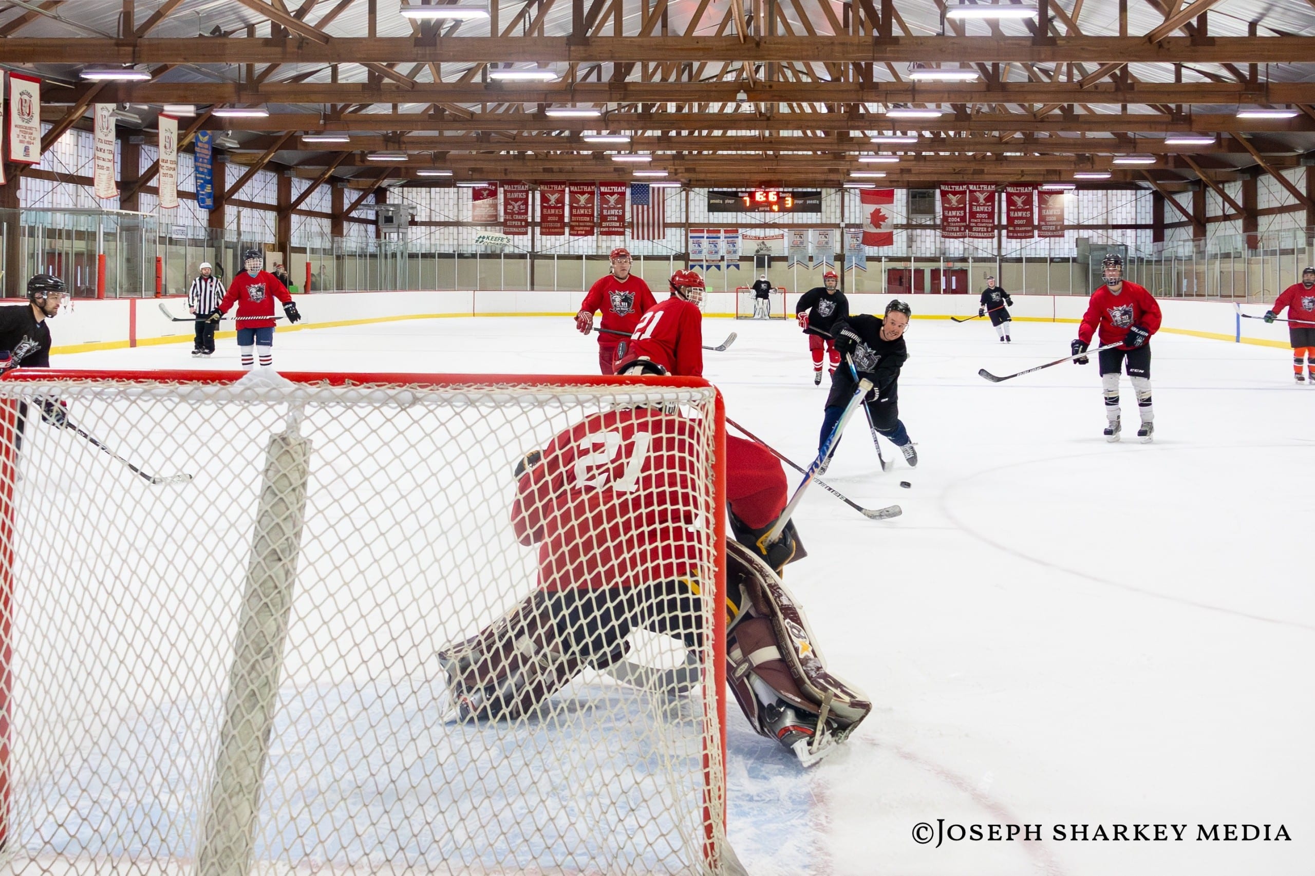 Team 3, in black jerseys, was made up of Franklin Pierce teammates and friends with a few Waltham players added. Team 21, in red, were WHS hockey alums. Billy Zeoli was the referee. Photo by Joseph Sharkey.