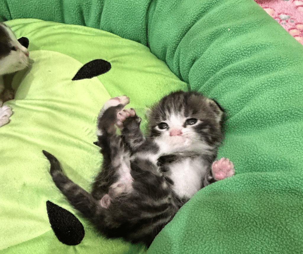 Over two days, the AirTag signal showed a pattern: the cat repeatedly crossed the street and lingered in the same debris pile. The volunteers eventually realized she was going inside the storage facility. After extensive searching, the team found the kittens — six tiny newborns, estimated to be about two weeks old — tucked inside a box of T-shirts.
