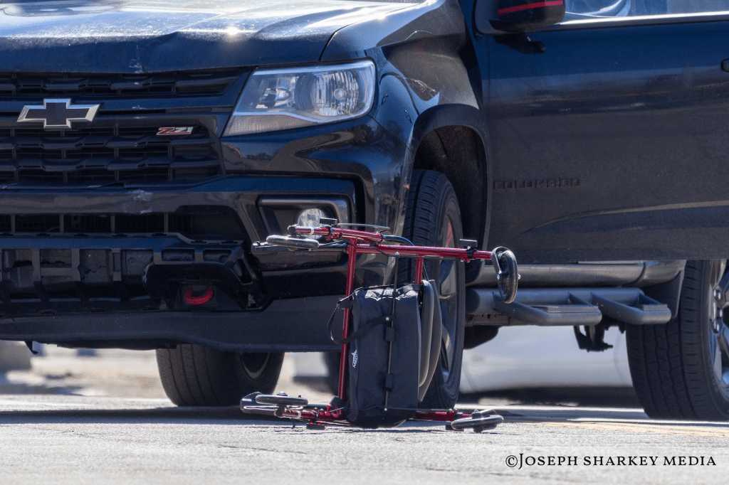 The crash occurred around 10:15 a.m. at the intersection of Elm and Carter streets, according to information from the scene. The pedestrian was transported to Lahey Hospital with injuries. The extent of those injuries was not immediately known.