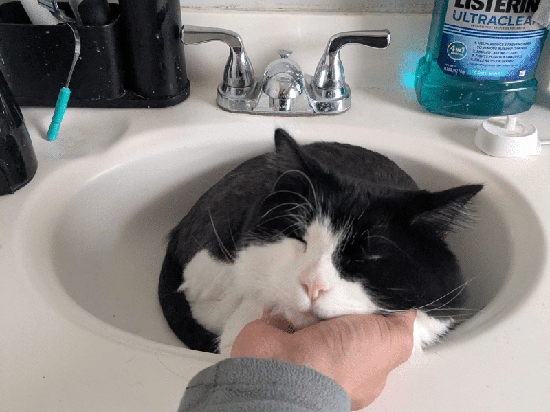 In the evenings, Phin’s zoomies kick in and he dashes happily around the house. A feline friend around his age (or younger) would likely be a wonderful match, giving him a buddy to help burn off that kitten energy.
