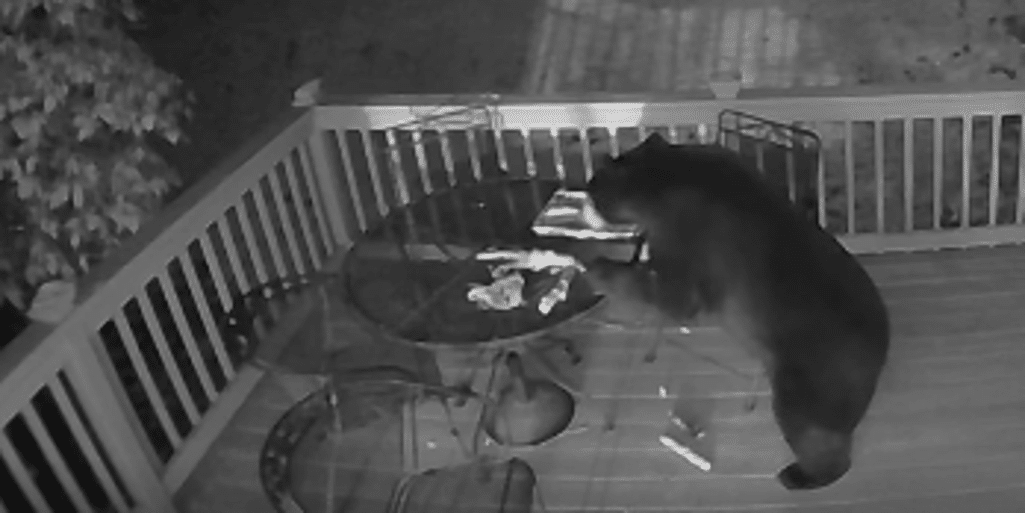 The footage, from March 17 and posted by Wes O’Connor on Facebook, shows the bear making its way onto the porch of a Goldencrest Avenue house and poking around items atop an outdoor table.