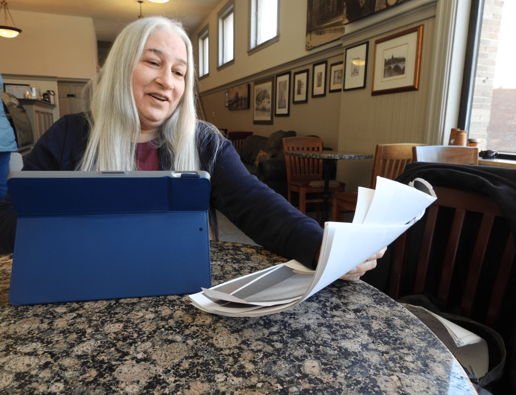 Waltham resident Deb Herman enjoy a peaceful morning at Cafe on the Common, deciphering a 1935 letter she’s digitizing for the Charles River Museum of Industry & Innovation. She said she loves this volunteer task, savoring the cadences of written English from the past. Herman is a tireless volunteer for organizations throughout the city, including the Waltham Times.