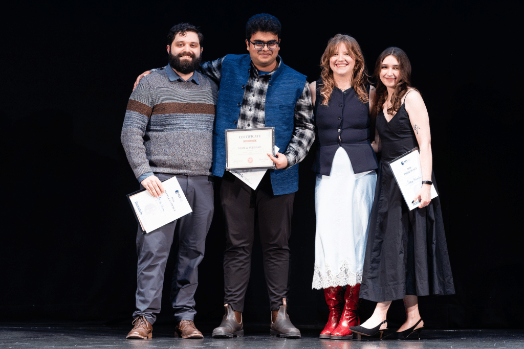 Winners of the Three-Minute Thesis Competition at Brandeis University are (from left to right) Mike Vivian, the People’s Choice Award; Arjun Kumar Singh, first place; Cali McKenzie, second place; and Dagny Michaels, third place. Photo credit: Gaelen Morse.