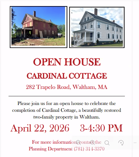 - Learned that the city is seeking a 40B waiver from the Zoning Board of Appeals to allow two units of subsidized housing at Cardinal Cottage on the Fernald property. A public open house will take place April 22 from 3 to 4:30 p.m, and a ZBA hearing is scheduled for April 28.