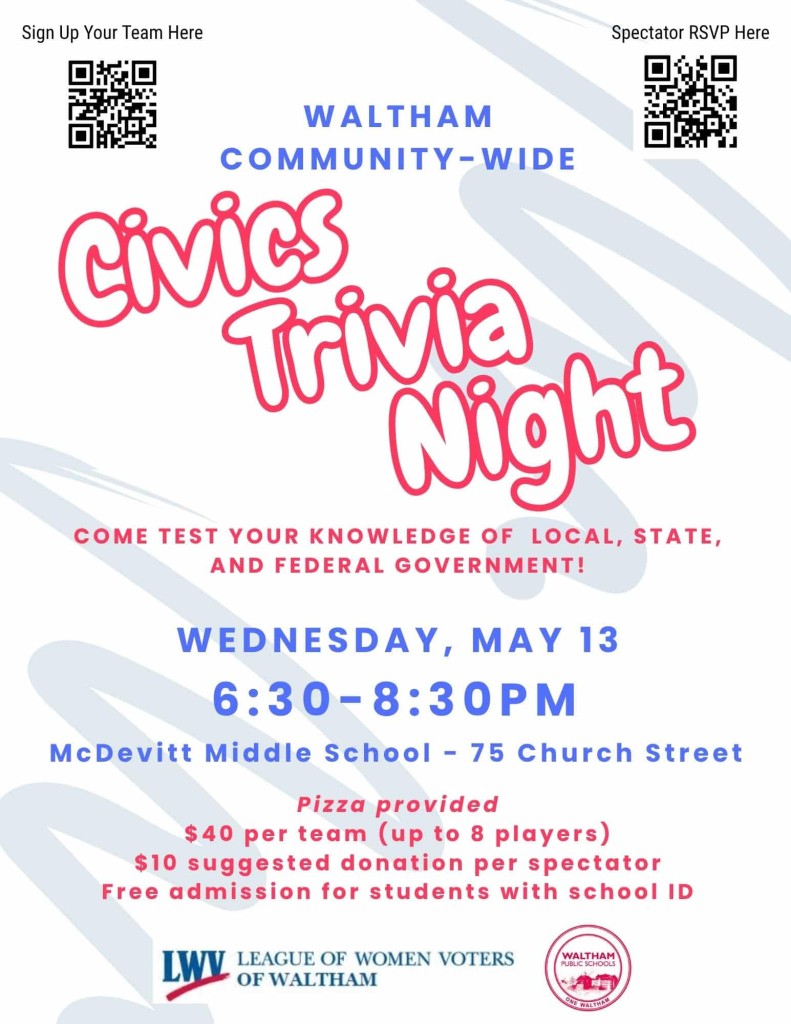 Think you know your local government? Up for a challenge on history, voting and how it all works? The League of Women Voters of Waltham is inviting the community to put their knowledge to the test at a Civics Trivia Night on Wednesday, May 13, from 6:30 to 8:30 p.m. at McDevitt Middle School.