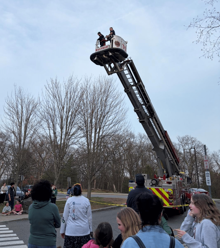 The Waltham Fire Department’s Student Awareness of Fire Education outreach team visited Northeast Elementary School for its Science, Technology, Engineering, Arts and Math (STEAM) night on Thursday, April 16. The Tower 1 crew helped with experiments by dropping various objects from its extended aerial platform. WFD SAFE Coordinator Lt. Mike Murphy joined the Tower 1 crew at the school for this annual event.
