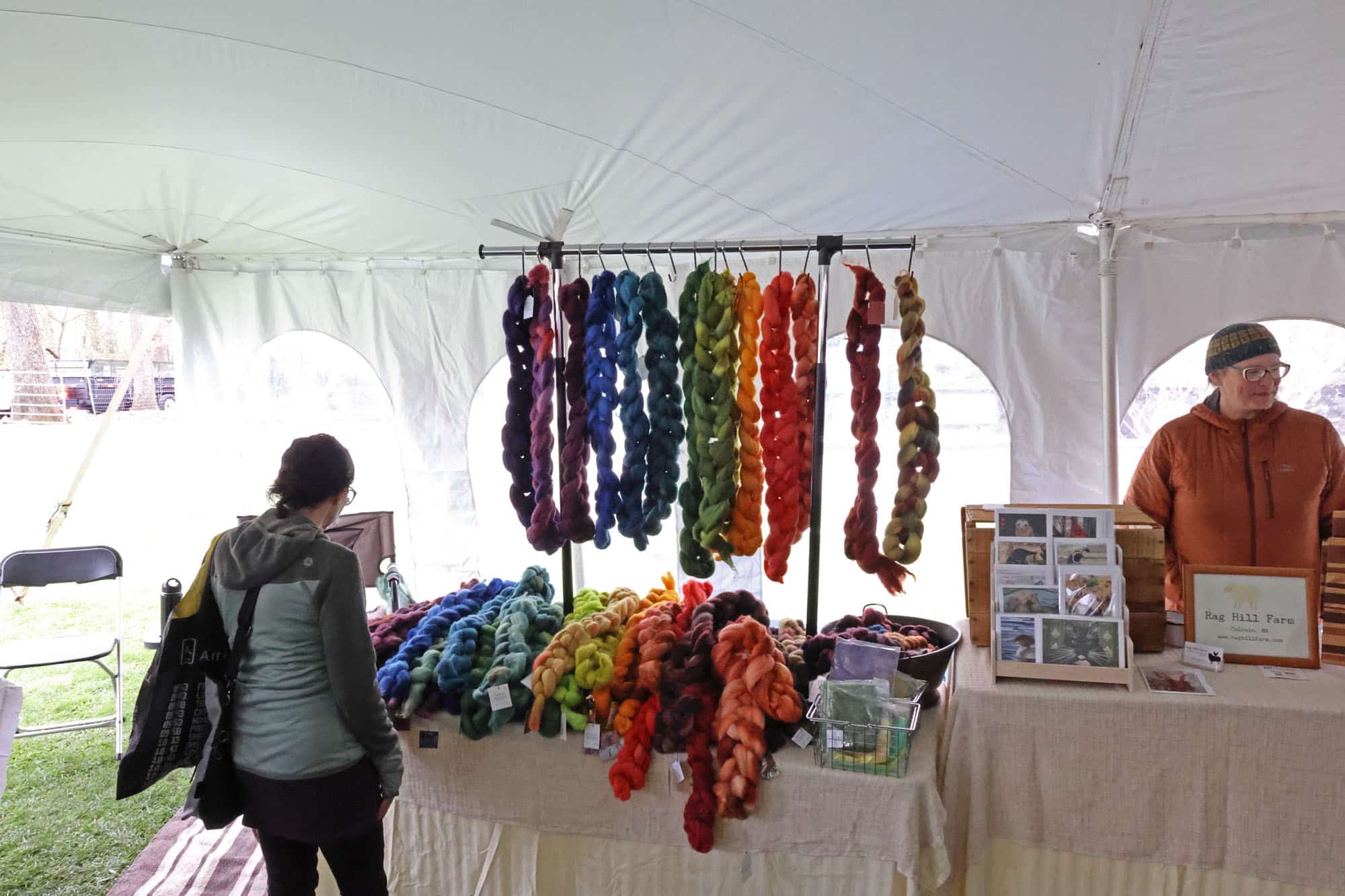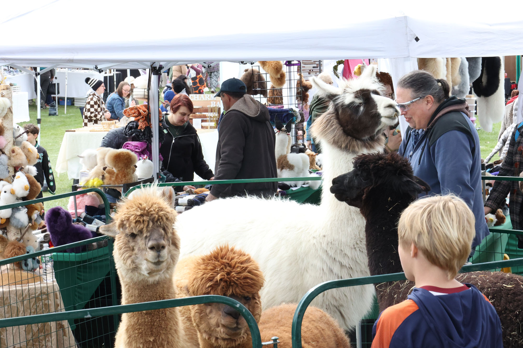 On the very end of one row of craft vendors were three alpacas and a llama from Plain View Farm in Hubbardston. Owner Keith Tetreault said he first got interested in llama farming years ago, when “the first llama I ever met kissed me.” Many years later, he bought four alpacas. Today he and his wife own 21 alpacas and three llamas. He shears them himself, and a mill makes the yarn for them, which is made into products like socks and gloves.