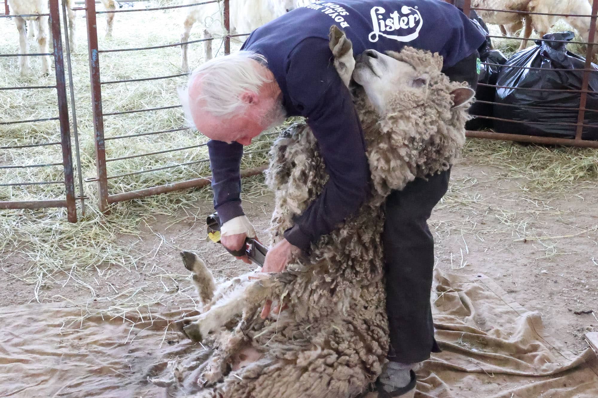 One at a time, they would take a sheep out of the pen to the shearing area. The animal would resist as much as it could, but Ford and Sullivan expertly pulled each sheep onto its back and then carefully cut away at the long woolly fleece. After a while, the sheep would relent and relax into their arms.