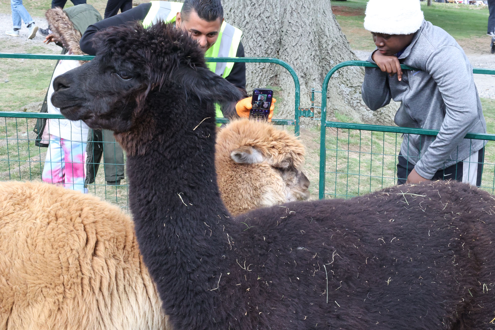 Julia the llama and Chloe, Nutmeg and Pollyanna the alpacas were fairly reserved with the human admirers who offered them food and tried to pet them. Tetreault explained that they are prey animals, so they need to be acutely alert to potential threats. “They will treat you as you prove to be,” he said.