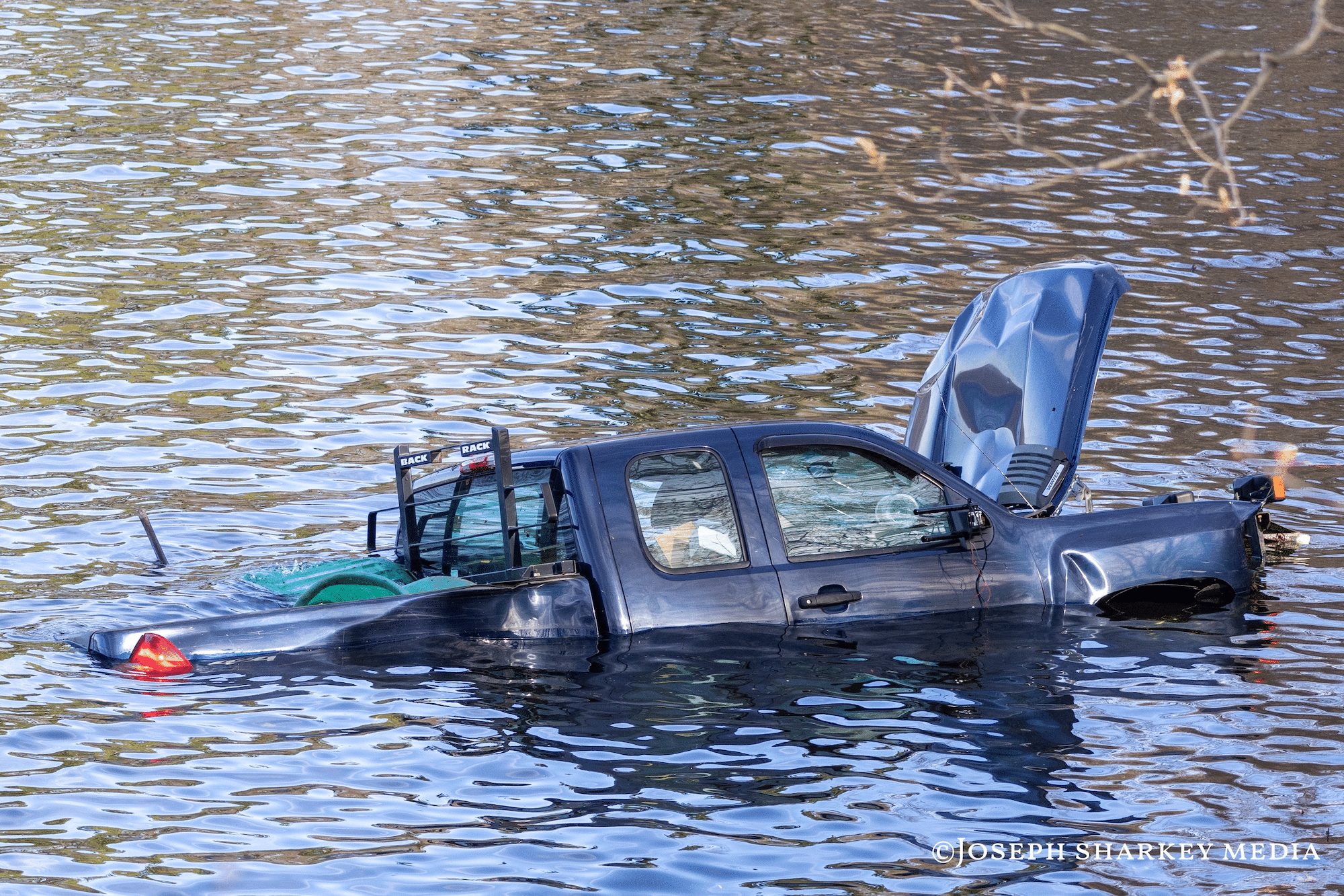 Waltham fire and police units arrived to find the vehicle submerged and initiated a water rescue. A dive team was deployed, and crews used a boat to contain potential fuel or fluid leaks and limit any environmental impact.