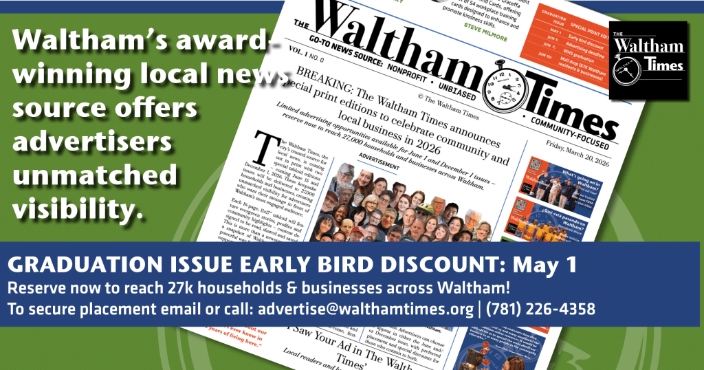 The Waltham Times offers advertising opportunities in our email newsletters and on our website to vetted organizations and businesses. When you advertise with us, you will support our nonprofit mission while reaching a highly engaged audience of residents in and around the City of Waltham that your business serves. It’s an opportunity you won’t find anywhere else.