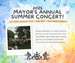 Waltham Common 610 Main St, Waltham, MA, United StatesBring a blanket or a lawn chair and join us for the Waltham Arts Council's free Concerts on the Common summer series. Every Tuesday night in July and August (rain dates: Thursdays of the same week). This week: Tom Bruhl Trio (Rock variety) Sponsored by Village Bank.