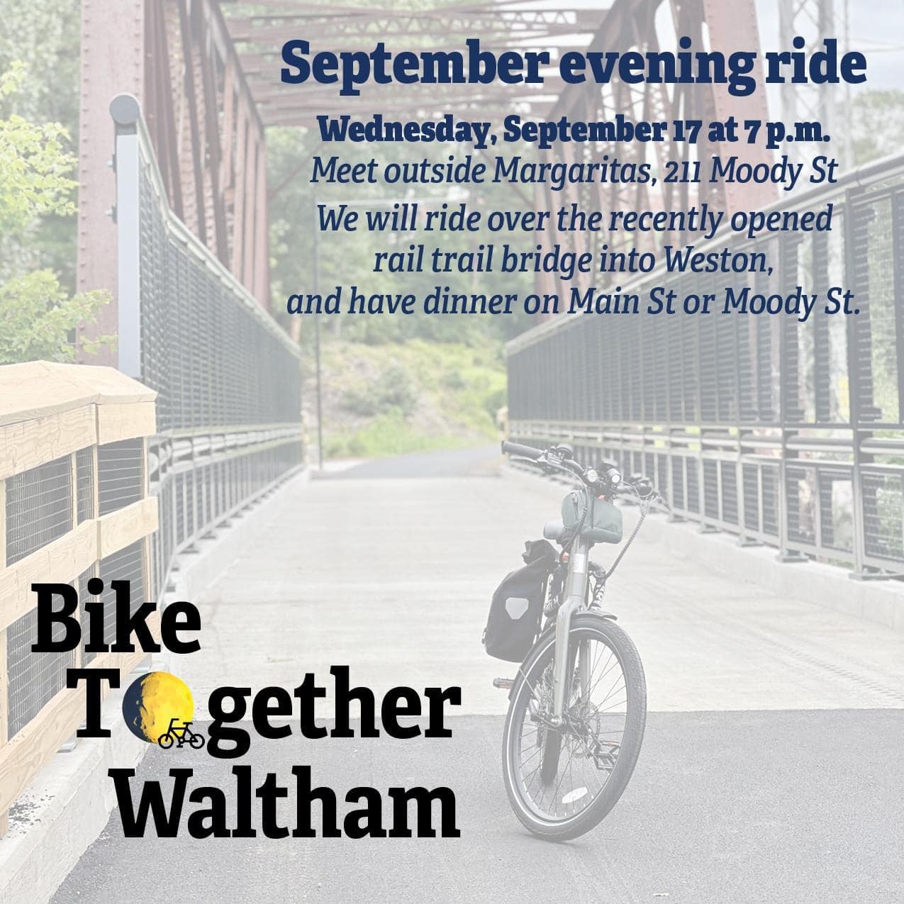 Margaritas 211 Moody Street, Waltham, MAOur June evening group ride will meet on the Moody Street Bridge outside Margaritas. We will ride a 6-mile route to Cedarwood and back to Moody Street and go out for dinner. Please bring front and back lights.