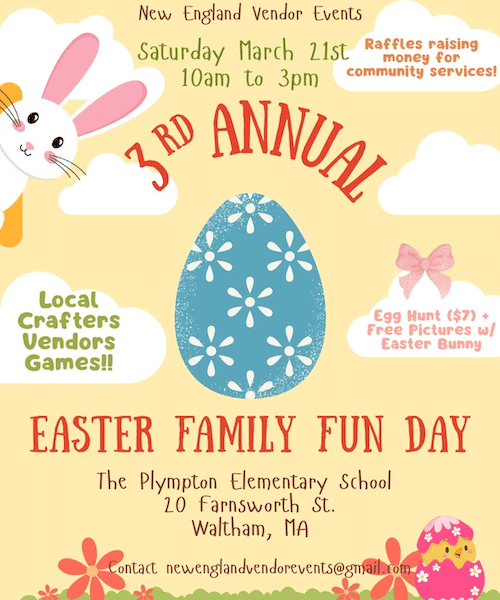 UPDATE: Change of venue to Plympton School, 20 Farnsworth Street, Waltham MA. Come on out for a fun-filled day of local vendors, free pictures with the Easter bunny, Easter egg […]